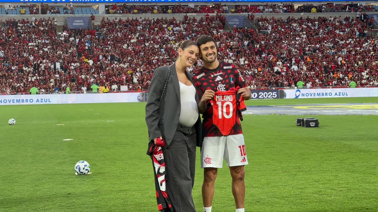 Arrascaeta posa com a esposa, Camilla, em homenagem do Flamengo