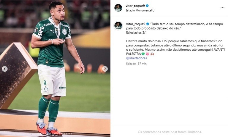 Vitor Roque publicou nesta segunda-feira uma mensagem após o vice-campeonato do Palmeiras na Conmebol Libertadores. O atacante, que se emocionou depois da derrota por 1 a 0 para o Flamengo, sábado, em Lima, tratou o resultado como doloroso.